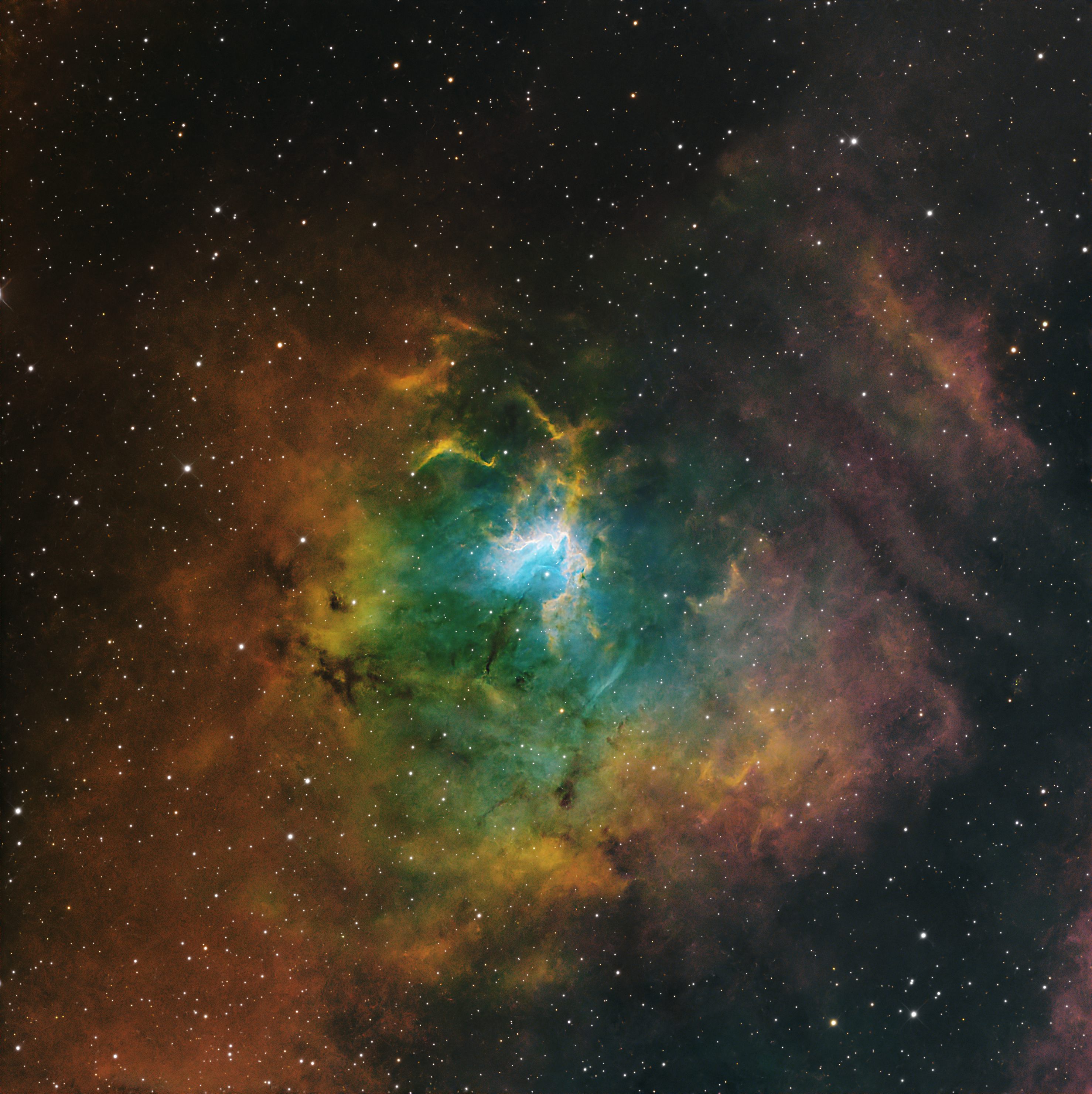 A bright emission nebula located at a distance of 9,800 light years. The evening of 3rd Jan 2026 was dominated by a full Moon for the whole night as it tracked high across the sky. This made any broadband imaging impossible especially as the Moon’s path ran across the majority of this season’s most interesting deep sky objects. That aside, the sky was nicely stable with good transparency allowing excellent guiding with only one dropped frame in nearly thirteen hours.