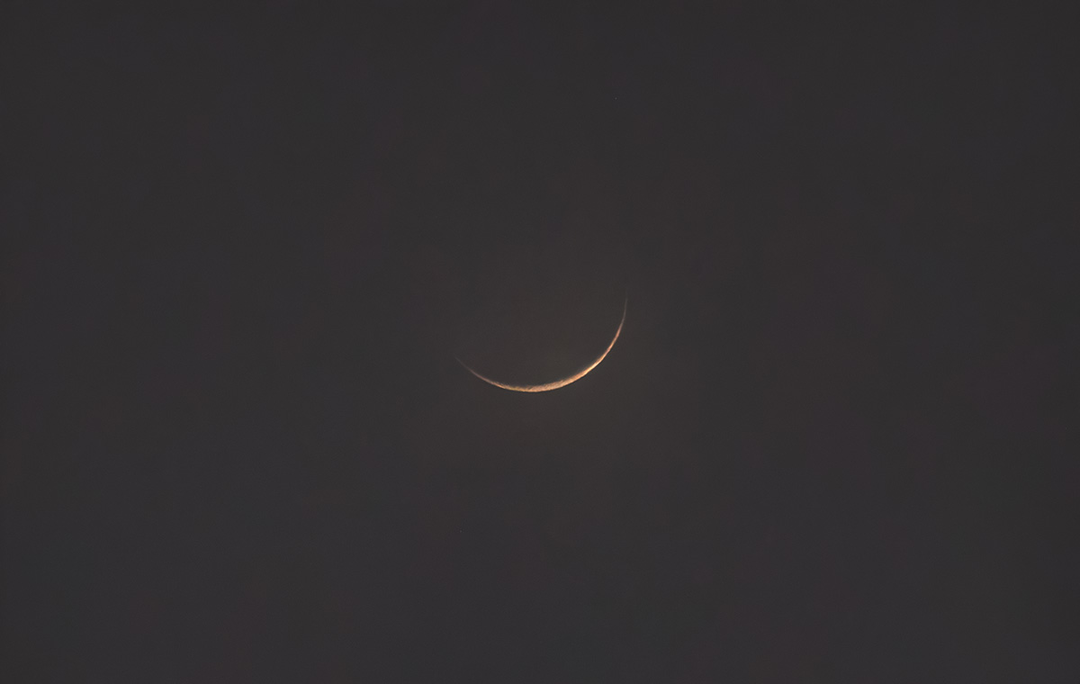 Having missed the slenderest crescent the previous day when only 17 hours after New Moon, I’d given up on seeing it but the day one Moon became unexpectedly visible in the cloud and atmospheric murk this evening. As the setting Sun dropped, the illuminated crescent appeared like a smile at around 10° above the horizon. In the Muslim calendar this represents a significant sighting as Eid and Navroz fall side by side. It was a beautiful and moving sight, indeed.