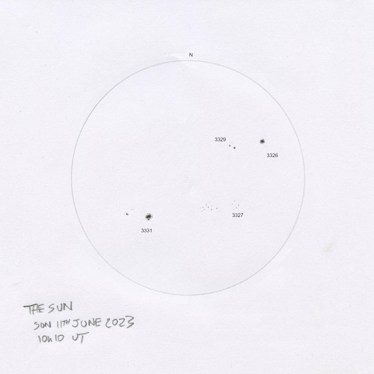 The Sun June 2023 (Annotated) Hand sketches of sun spots from white light observation. June 2, 2023 Mark 1 minute read Details Scope: Bresser Messier 8" Dobsonian Filters: Bresser Solar Filter Observations in reverse order Sun 24-06-2023 Sun 11-06-2023 Sun 02-06-2023